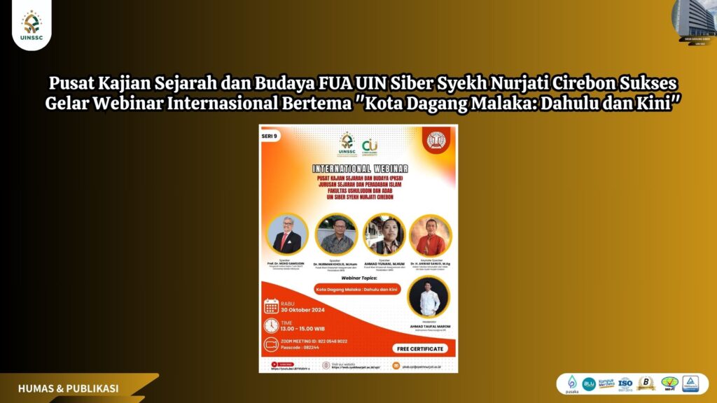 UIN Siber Cirebon – Pusat Kajian Sejarah dan Budaya (PKSB) Jurusan Sejarah dan Peradaban Islam, Fakultas Ushuluddin dan Adab, UIN Siber Syekh Nurjati Cirebon, telah sukses menyelenggarakan International Webinar dengan tema “Kota Dagang Malaka: Dahulu dan Kini” yang mengkaji peran historis dan budaya Malaka sebagai pusat perdagangan dan pendidikan Islam di Asia Tenggara. Webinar ini berlangsung secara hybrid dan dihadiri oleh lebih dari 300 peserta dari berbagai negara, yang dengan antusias menyimak paparan dari para pembicara terkemuka di bidang sejarah dan budaya. Rabu, (30/10/2024).