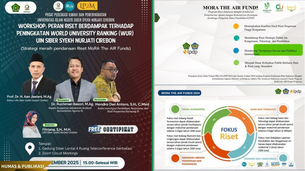 UIN Siber Cirebon – Universitas Islam Negeri (UIN) Siber Syekh Nurjati Cirebon kembali menunjukkan komitmennya dalam memperkuat budaya riset dengan menggelar Workshop “Peran Riset Berdampak terhadap Peningkatan World University Ranking (WUR)”. Kegiatan yang berlangsung di Ruang Konferensi Gedung Siber lantai 4 melalui Zoom Meeting ini menghadirkan jajaran Pusat Pembiayaan Pendidikan Agama dan Pendidikan Keagamaan (Puspenma) Sekretariat Jenderal Kementerian Agama RI. (17/09).