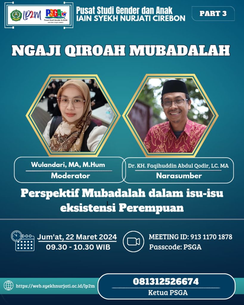 IAIN Cirebon – Kembali merangkai benang pemikiran untuk menggali lebih dalam tentang perspektif Mubadalah dalam isu-isu eksistensi perempuan, kampus IAIN Syekh Nurjati Cirebon menggelar kegiatan Qiroah Mubadalah. Program ini merupakan inisiatif dari Pusat Studi Gender dan Anak (PSGA), Lembaga Penelitian dan Pengabdian Kepada Masyarakat (LP2M), dengan semangat untuk memperkaya diskusi keislaman yang lebih inklusif. Kegiatan berlangsung pada Jum’at, (22/03/2024).