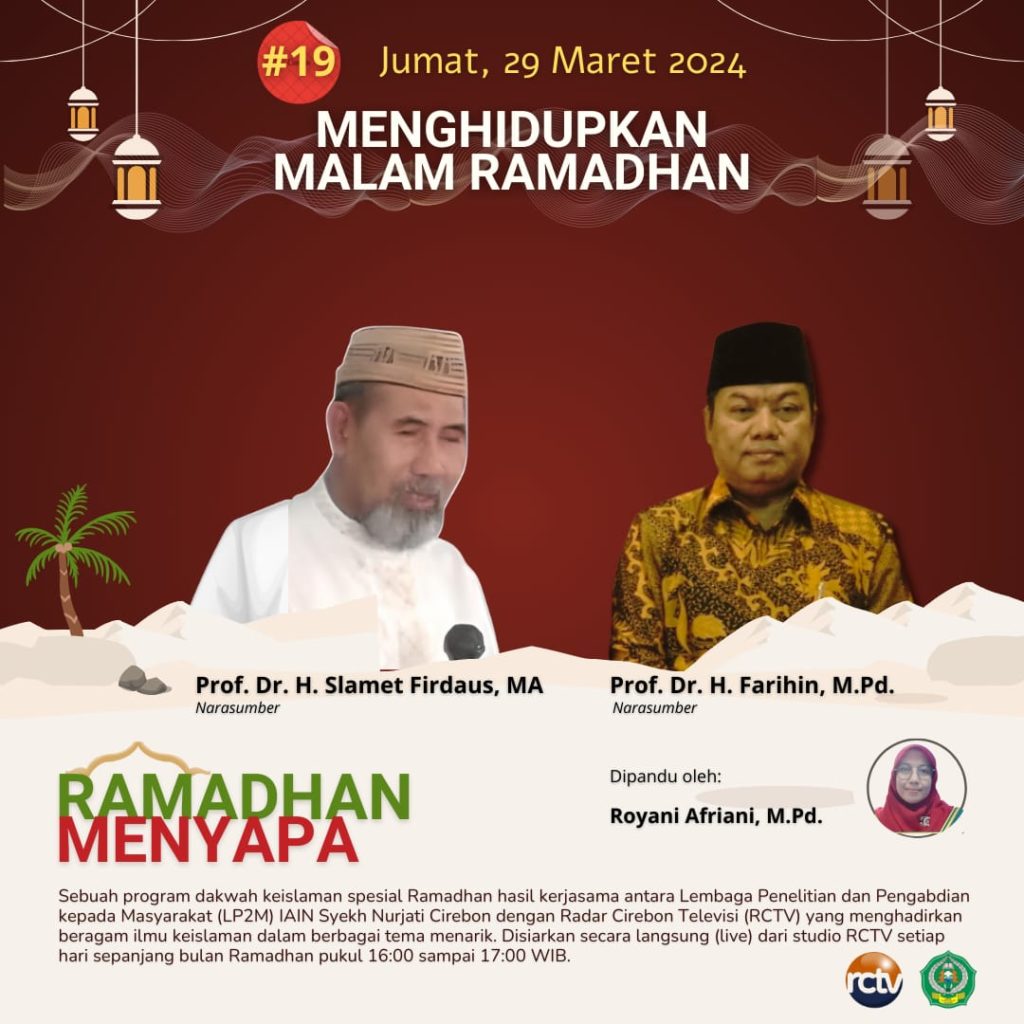 IAIN Cirebon – Semangat Ramadhan terus membara di setiap sudut kota, dan pada hari kesembilanbelas ini, Jum’at, 29 Maret 2024, “Ramadhan Menyapa” kembali menghadirkan sebuah perbincangan yang memikat hati. Kerja sama antara Lembaga Penelitian dan Pengabdian kepada Masyarakat (LP2M) IAIN Syekh Nurjati Cirebon dengan Radar Cirebon Televisi (RCTV) semakin menambah warna dalam perayaan bulan suci ini.