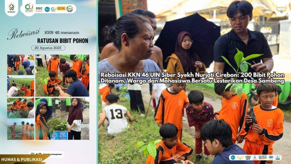 UIN Siber Cirebon (Sambeng) — Mahasiswa Kuliah Kerja Nyata (KKN) Kelompok 46 Universitas Islam Negeri (UIN) Siber Syekh Nurjati Cirebon (UIN SSC) bersama warga Desa Sambeng melaksanakan kegiatan reboisasi dengan menanam 200 bibit pohon di depan SDN 2 Sambeng. Kegiatan ini menjadi wujud nyata kepedulian mahasiswa terhadap isu lingkungan sekaligus upaya membangun kesadaran kolektif masyarakat tentang pentingnya menjaga kelestarian alam.(20/08).