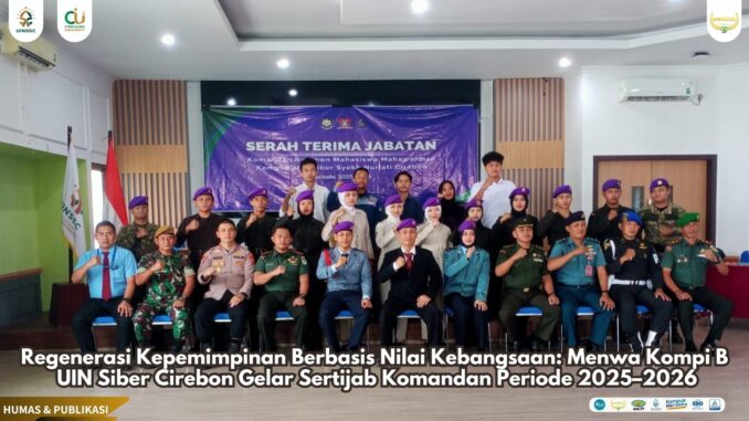 UIN Siber Cirebon — Komando Resimen Mahasiswa (Menwa) Mahawarman Kompi B Universitas Islam Negeri (UIN) Siber Syekh Nurjati Cirebon kembali meneguhkan komitmennya terhadap regenerasi kepemimpinan yang berkelanjutan dan berbasis nilai-nilai kebangsaan. Dalam suasana khidmat, kegiatan Serah Terima Jabatan (Sertijab) Komandan Kompi B Periode 2025–2026 digelar di Gedung Rektorat Lantai 3 UIN SSNJ, Senin (23/06), sebagai bagian penting dari proses kaderisasi organisasi semi-militer tersebut.