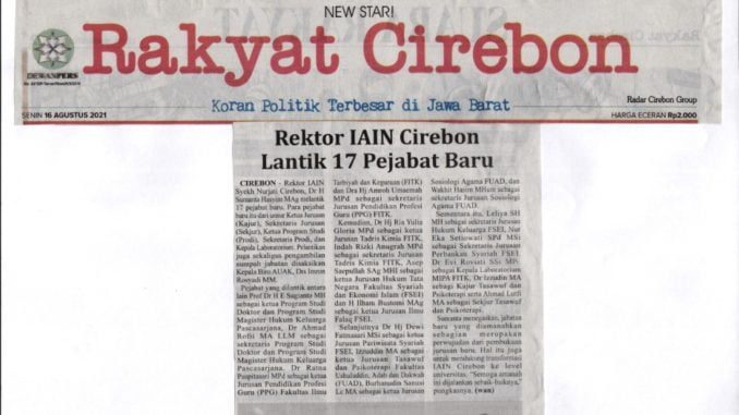 Rektor IAIN Cirebon Lantik 17 Pejabat Baru (Rakyat Cirebon/16 Agustus 2021) 13 Oktober 2021 arifin Kliping Digital 0 Rektor IAIN Cirebon Lantik 17 Pejabat Baru