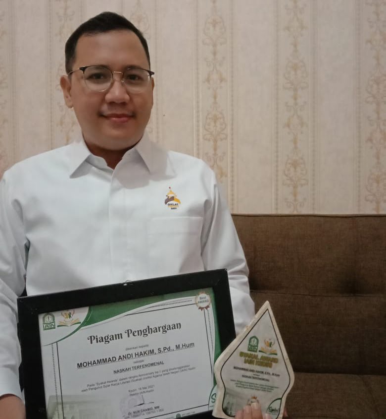 Cirebon (19/12). Apresiasi lembaga pendidikan tinggi atas prestasi akademik dosen menjadi bagian tak terpisahkan dalam agenda membangun kerja-kerja ilmiah dan pengabdian kepada masyarakat. Seperti yang dilakukan oleh Institut Agama Islam Negeri (IAIN) Kediri melalui Syiar Karya Literasi (Syakal) Award tingkat nasional tahun 2021. Kanal literasi ini diinisiasi oleh perpustakaan pusat IAIN Kediri. Mohammad Andi Hakim, M.Hum, dosen BSA IAIN Syekh Nurjati Cirebon dinobatkan sebagai peraih penghargaan pada kategori naskah terfenomenal. Naskah berjudul Membongkar ‘Agama’ Korupsi dan Upaya Menyelamatkan Pendidikan Kita mendapat apresiasi tinggi dari masyarakat dan memikat juri pada kegiatan Syakal Award tahun 2021. Puluhan naskah dari seluruh Indonesia terjaring dan terseleksi dengan ketat. Oleh karena itu, Rektor IAIN Kediri Dr. Nur Chamid, MM memberikan penghargaan tersebut.