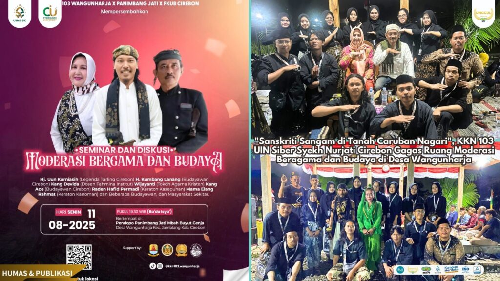 UIN Siber Cirebon (Wangunharjo) — Dalam semangat merawat keberagaman dan memperkuat jalinan harmoni sosial, mahasiswa KKN 103 UIN Siber Syekh Nurjati Cirebon sukses menggelar Seminar dan Diskusi Moderasi Beragama dan Budaya bertajuk “Sanskriti Sangam di Tanah Caruban Nagari: Menjembatani Kebudayaan dengan Moderasi Beragama”, pada Senin malam (11/8), bertempat di Pendopo Penimbangan Jati, Desa Wangunharja, Kecamatan Jamblang.