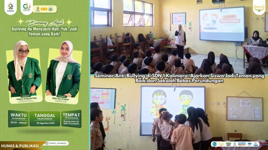 UIN Siber Cirebon (Kalimaro) – Isu perundungan (bullying) di sekolah dasar kembali mendapat perhatian melalui kegiatan Seminar Anti-Bullying yang dilaksanakan di SDN 1 Kalimaro, Kecamatan Gebang, Kabupaten Cirebon. Seminar ini mengusung tema “Bullying Itu Menyakiti Hati: Yuk, Jadi Teman yang Baik!” dan diikuti oleh 120 siswa kelas 5 dan 6. (09/08).