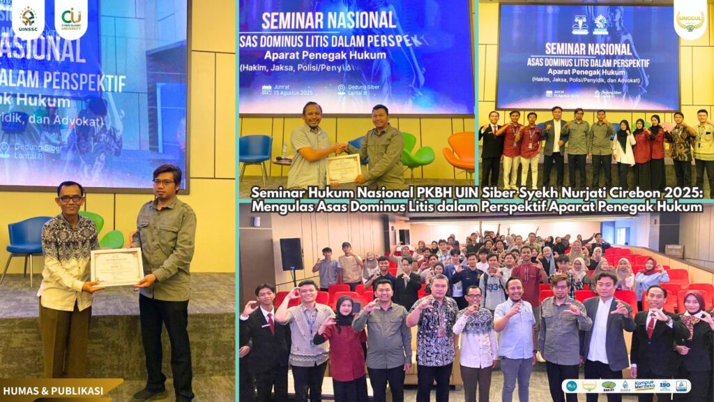 UIN Siber Cirebon – Pusat Konsultasi dan Bantuan Hukum (PKBH) UIN Siber Syekh Nurjati Cirebon sukses menyelenggarakan Seminar Hukum Nasional bertajuk “Asas Dominus Litis dalam Perspektif Aparat Penegak Hukum (Hakim, Jaksa, Polisi/Penyidik, dan Advokat)” pada Jumat (15/08). Kegiatan berlangsung di Gedung Siber Lantai 8 UIN SSC dan dihadiri lebih dari 100 peserta dari kalangan mahasiswa, akademisi, praktisi hukum, serta masyarakat umum.