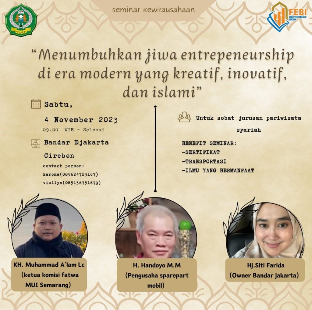 IAIN Cirebon – Jurusan Pariwisata Syariah IAIN Syekh Nurjati Cirebon menggelar acara penting yang bertujuan memperkuat pemahaman matakuliah Kewirausahaan dan Halalpreneurship. Diprakarsai oleh KH. Muarifin, seminar bertemakan “Menumbuhkan jiwa entrepreneurship di era modern yang kreatif, inovatif, dan Islami”, diselenggarakan di Bandar Jakarta Cirebon, Jl. DR Cipto Mangunkusumo no.207. Acara seminar dihadiri oleh Dr. H. Didi Sukardi, MH, Dekan Fakultas Ekonomi dan Bisnis Islam IAIN Syekh Nurjati Cirebon. Hadir juga Dr. Hj. Dewi Fatmasari, SE., M.Si sebagai Wakil Dekan II FEBI, Yati Haryati, M.Sc sebagai sekretaris Jurusan Pariwisata Syariah, dan para dosen Jurusan Pariwisata Syariah.Sabtu, 4 November 2023.