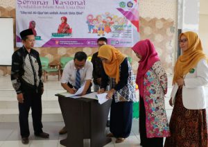 Tadris Pendidikan Islam Anak Usia Dini (PIAUD) Fakultas Ilmu Tarbiyah dan Keguruan (FITK) IAIN Syekh Nurjati Cirebon bekerjasama dengan Program Studi Pendidikan Islam Anak Usia Dini (PIAUD) Universitas Singaperbangsa Karawang menandatangani nota kesepahaman (MoU) dalam rangka pelaksanaan tridharma perguruan tinggi. Selanjutnya diadakan Seminar Nasional Bersama dengan tema ” Literasi Al Qur’an untuk Anak Usia Dini” bertempat di gedung pascasarjana lantai 3. Kegiatan tersebut dihadiri oleh Dr. H. Saefudin, M. Ag (Wadek FITK) beserta staf dan dosen FITK, dari pihak Singaperbangsa Lilis Karyawati, M.Ag beserta staf jajarannya dan mahasiswa. Sebagai narasumber kegiatan tersebut Lilis Karyawati, M.Ag (Narasumber dari Universitas Singaperbangsa Karawang) dan Prof Dr. Hj. Eti Nurhayati, M.Si (Narasumber dari IAIN Syekh Nurjati Cirebon). Kegiatan tersebut diikuti 262 peserta yang terdiri 200 peserta dari IAIN Syekh Nurjati Cirebon dan 62 peserta dari Universitas Singaperbangsa Karawang. Senin (23/12)