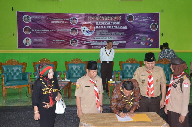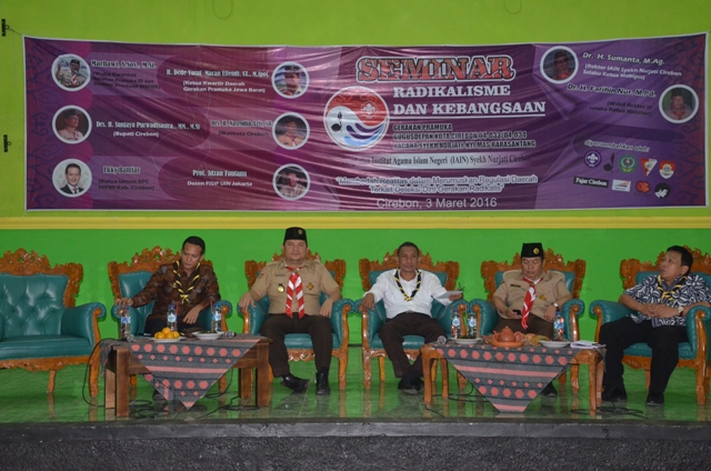 Kamis, 3 Maret 2016 di ICC digelar acara Seminar “Radikalisme & Kebangsaan” oleh UKM PRAMUKA Racana Syekh Nurjati – Nyi Mas Rarasantang Gugus Depan 04.033-04.034 Pangkalan IAIN Syekh Nurjati Cirebon, Penanggungjawab kegiatan adalah Ahmad Rifqi Abdillah dan Tina Sulistia sementara untuk Ketua Pelaksana Kegiatan Supriyadi. Dalam acara seminar ini menghadirkan banyak Narasumber diantaranya Prof. Idzan Fautanu Dosen UIN Jakarta), Marbawi, S. Sos., M.Si (Waka Kwarnas Gerakan PRAMUKA RI & Direktur Eksekutif INSPIRE) dan Ekky Bahtiar (Ketua BPC HIPMI Kab. Cirebon). Seminar ini bertujuan untuk mempererat NKRI dan menolak Faham Radikalisme negatif, memberikan pemahaman yang positif kepada untuk dapat hidup mandiri secara etika moral dan ekonomi serta membentuk gerakan yang positif yakni gerakan Scout and Spiritual, Preneurship. Panitia dalam acara ini juga mengunang 1. Pemerintah Daerah se-Wilayah III Cirebon, 2. Kwarcab Ciayumajakuning, 3. Pengasuh PONPES se-Wilayah III Cirebon, 4.Ketua UKM dilingkungan IAIN Syekh NUrjati Cirebon, 5. Ketua Himpunan Pergerakan, 6. Ketua Pramuka dan Pembina di SMA/ MA/ SMK se-Wilayah III Cirebon.
