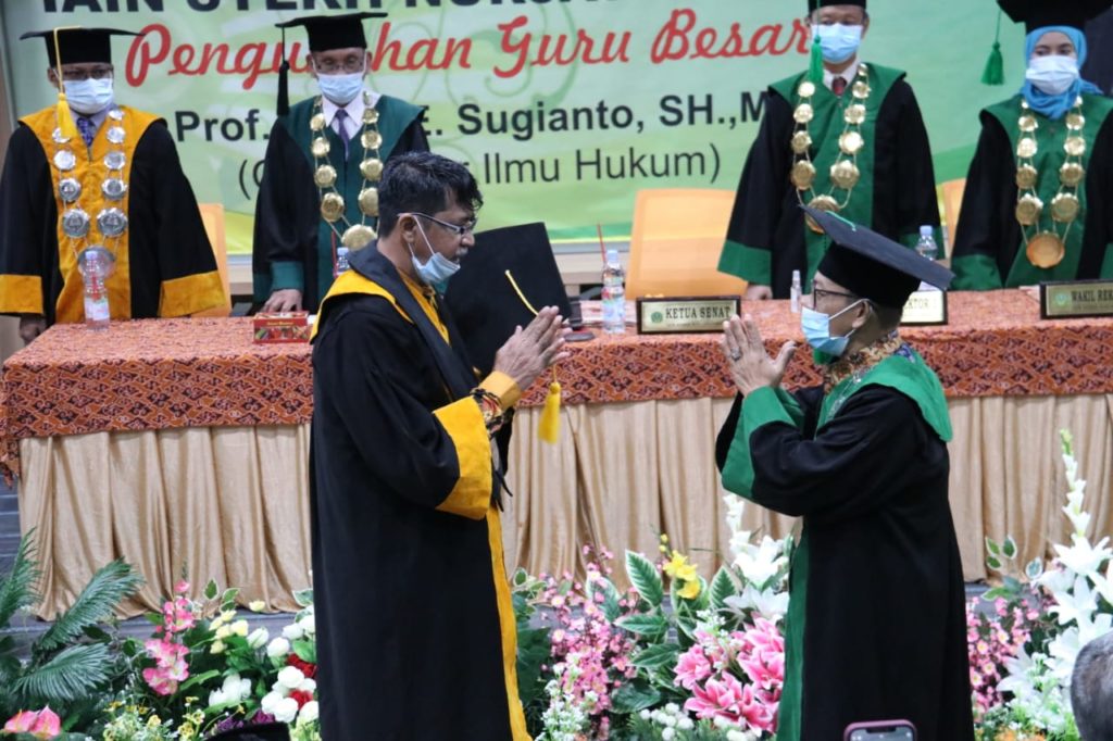 Dia adalah, Prof Dr E Sugianto SH MH. Diketahui, Surat Keputusan (SK) Menteri Pendidikan dan Kebudayaan Republik Indonesia, Prof Sugianto telah ditetapkan sebagai guru besar di bidang Ilmu Hukum terhitung sejak 1 November 2020 dengan angka kredit 894.