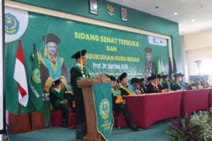 Acara kemudian dilanjut dengan orasi ilmiah yang langsung disampaikan oleh Prof. Dr. Kartimi, M.Pd yang mengupas tentang “Membangun Tradisi Ilmiah Dalam Upaya Meningkatkan Kualitas Sumber Daya Manusia Berdaya Saing, Unggul dan Terkemuka”.