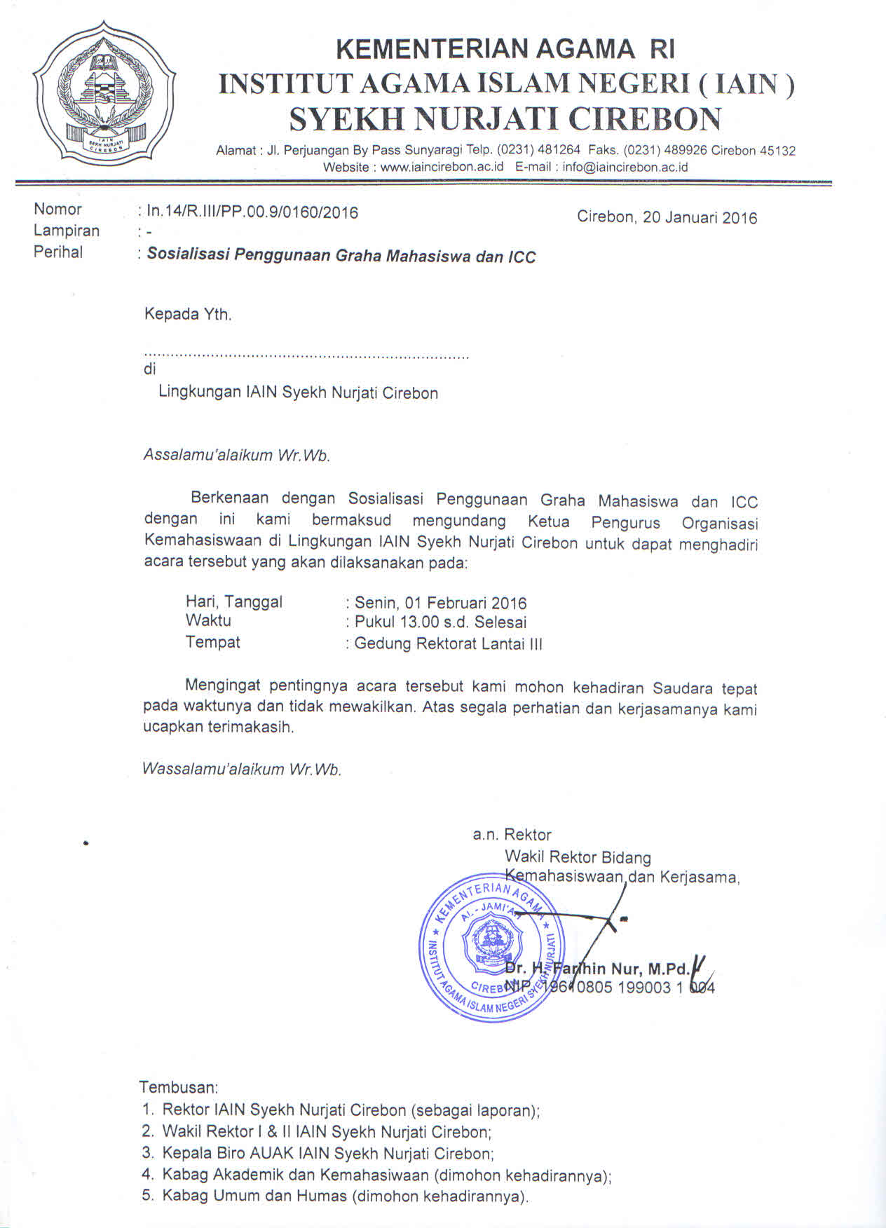 Berkenaan dengan sosialisasi penggunaan Graha Mahasiswa dan ICC, dengan ini mengundang Ketua-ketua Organisasi Kemahasiswaan di Lingkungan IAIN Syekh Nurjati Cirebon untuk hadir pada: