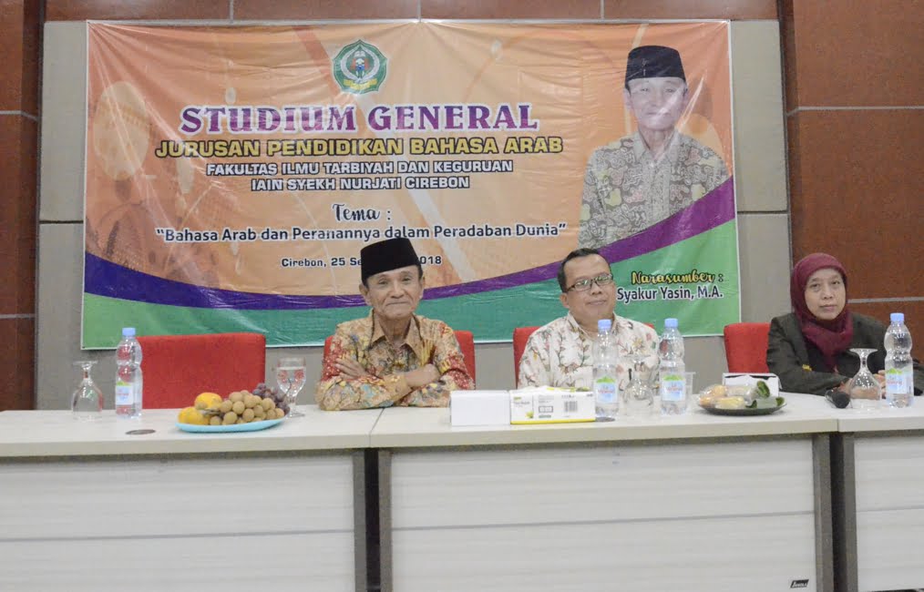Himpunan Mahasiswa Jurusan (HMJ) Jurusan Pendidikan Bahasa Arab (PBA) Fakultas Ilmu Tarbiyah dan Keguruan (F-ITK) IAIN Syekh Nurjati Cirebon menggelar STADIUM GENERAL dengan tema “Bahasa Arab dan Peranannya dalam Peradaban Dunia” di Aula Fakultas Ushuluddin Adab dan Dakwah (F-UAD) lantai 04. Kegiatan diikuti 250 peserta yang terdiri dari tamu undangan, Segenap Dosen PBA dan mahasiswa jurusan PBA. Sebagai penanggung jawab kegiatan Masri’ah, M.Ag . Tujuan dilaksanakan kegiatan tersebut adalah untuk memotivasi, membiasakan mahasiswa khususnya jurusan PBA untuk lancar berbahasa arab dengan baik dan benar, sebagai narasumber Dr. KH. Syakur Yasin, M.A . Kegiatan tersebut dibuka oleh Dr. Muslihudin, M.Ag (Wadek I). Selasa(25/09).