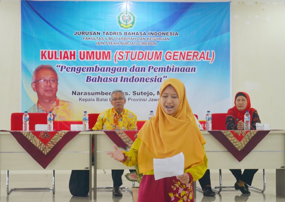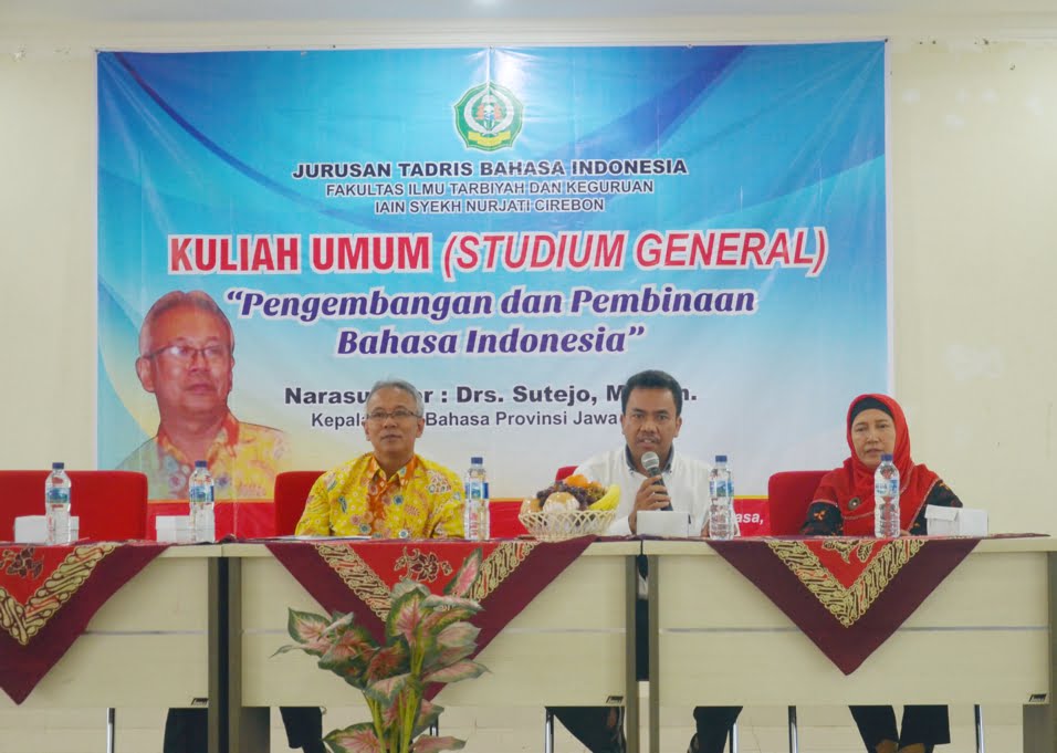 Himpunan Mahasiswa Jurusan (MHJ) Tadris Bahasa Indonesia Fakultas Ilmu Tarbiyah dan Keguruan (F-ITK) IAIN Syekh Nurjati Cirebon menggelar kegiatan Stadium General dengan Tema “Pengembangan dan Pembinaan Bahasa Indonesia” di gedung SBSN Lantai 4. Tujuan dilaksanakan kegiatan tersebut adalah menumbuhkan rasa cinta dan bangga pada bahasa indonesia. Sebagai tamu undangan dan sekaligus narasumber Drs. Sutejo, M.Hum (Kepala Badan bahasa Provinsi Jawa Barat) Kegiatan dibuka oleh Dr. Ilman Nafi’a, M.Ag. (Dekan F-ITK) dan sebagai penanggung jawab kegiatan Dra. Tati Sri Uswati, M.Pd., kegiatan dihadiri sekitar 120 peserta. Selasa. (15-05-18).