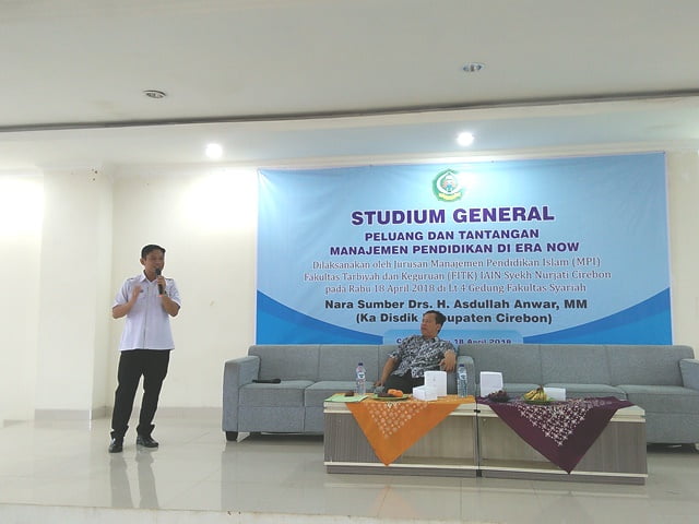 Jurusan Manajemen Pendidikan Islam (MPI) Fakultas Ilmu Tarbiyah dan Keguruan IAIN Syekh Nurjati Cirebon, mengadakan kegiatan Studiun General dengan Tema ” Peluang dan tantangan Manajemen Pendidikan Islam di Era Now“. yang ikuti oleh 155 peserta terdiri dari dosen dan Mahasiswa. Dengan menghadirkan pemateri Dr. Alex Suheriyawan, S. P,. S.H (kepala Bidang PNF Dinas Pendidikan Kabupaten Cirebon) Di Gedung SBSN Fakultas Syariah Ekonomi Islam Lt. 4. Rabu, (18/04/18).