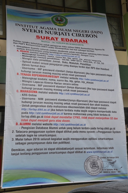 Dalam rangka kebutuhan pelaporan data online EMIS Kementerian Agama RI dan PDPT Kemenristek DIKTI yang diperuntukkan bagi Dosen, Tenaga Kependidikan, Mahasiswa dan Alumni IAIN Syekh Nurjati Cirebon. Surat Edaran mohon dibaca, pahami dan untuk segera dilaksanakan.