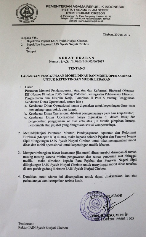 Surat edaran larangan menggunakan mobil dinas dan operasional untuk kepentingan mudik lebaran 21 Juni 2017 arifin Informasi 0 Humas dan Publikasi