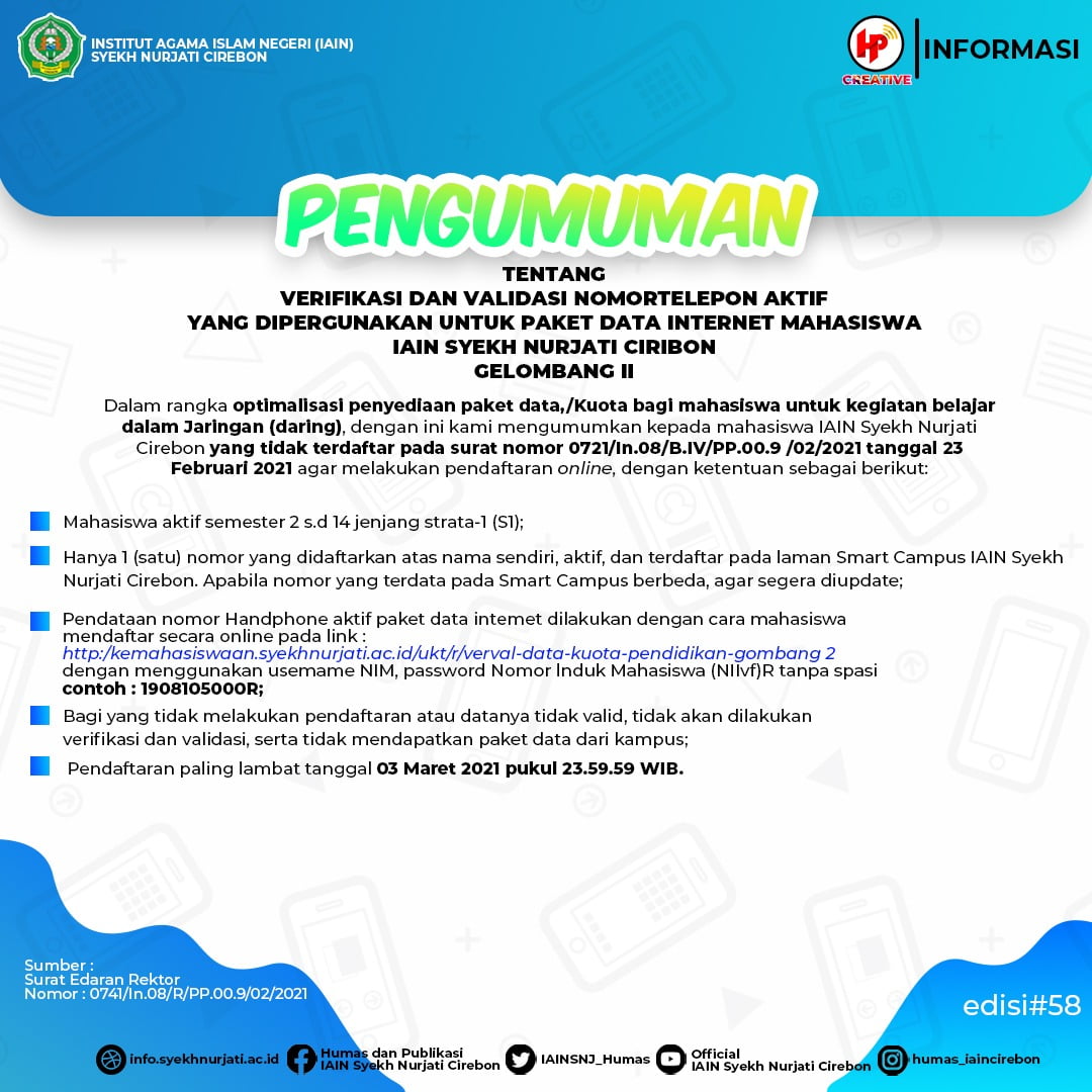 24 February 2021 • PENGUMUMAN VERIFIKASI DAN VALIDASI NOMOR TELEPON AKTIF GELOMBANG II UNDUH PENGUMUMAN verval paket data02242021143950 Pengumuman