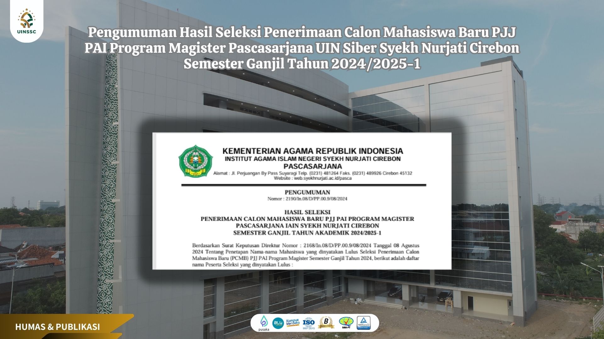 9 August 2024 • 4 Views • Pengumuman Hasil Seleksi Penerimaan Calon Mahasiswa Baru PJJ PAI Program Magister Pascasarjana UIN Siber Syekh Nurjati Cirebon Semester Ganjil Tahun 2024/2025-1 Untuk Informasi Selengkapnya Silahkan Unduh Link dibawah ini : Pengumuman SPMB PJJ (Ganjil)-1 2024-2025 dan... Informasi Pengumuman