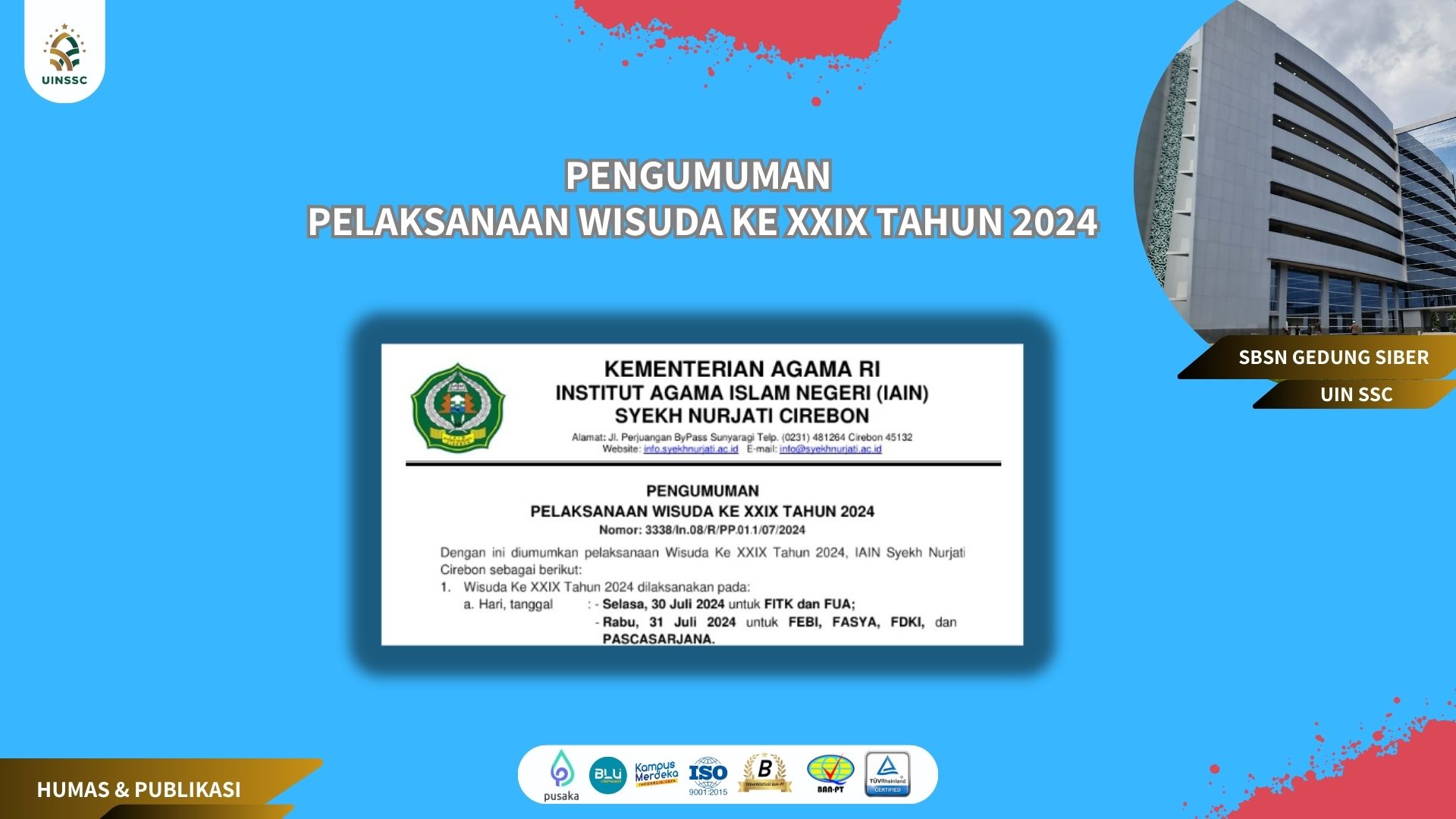 17 July 2024 • PENGUMUMAN PELAKSANAAN WISUDA KE XXIX TAHUN 2024 Untuk Informasi Selengkapnya Silahkan Unduh Link dibawah ini : B-3338_Pengumuman Wisuda 29 Tahun 2024 Informasi Pengumuman