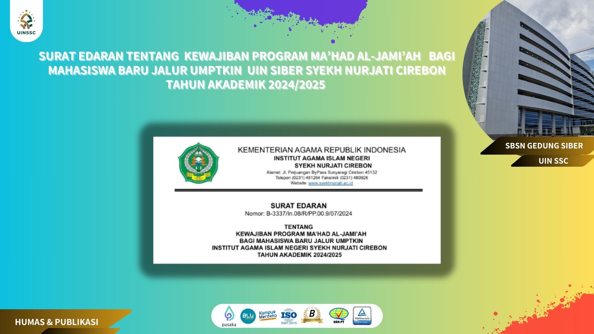 17 July 2024 • SURAT EDARAN TENTANG KEWAJIBAN PROGRAM MA’HAD AL-JAMI’AH BAGI MAHASISWA BARU JALUR UM-PTKIN UIN SIBER SYEKH NURJATI CIREBON TAHUN AKADEMIK 2024/2025 Untuk Informasi Selengkapnya Silahkan Unduh Link dibawah ini: B-3337_Surat Edaran Mahad Bagi Mahasiswa Baru Jalur... Informasi Pengumuman