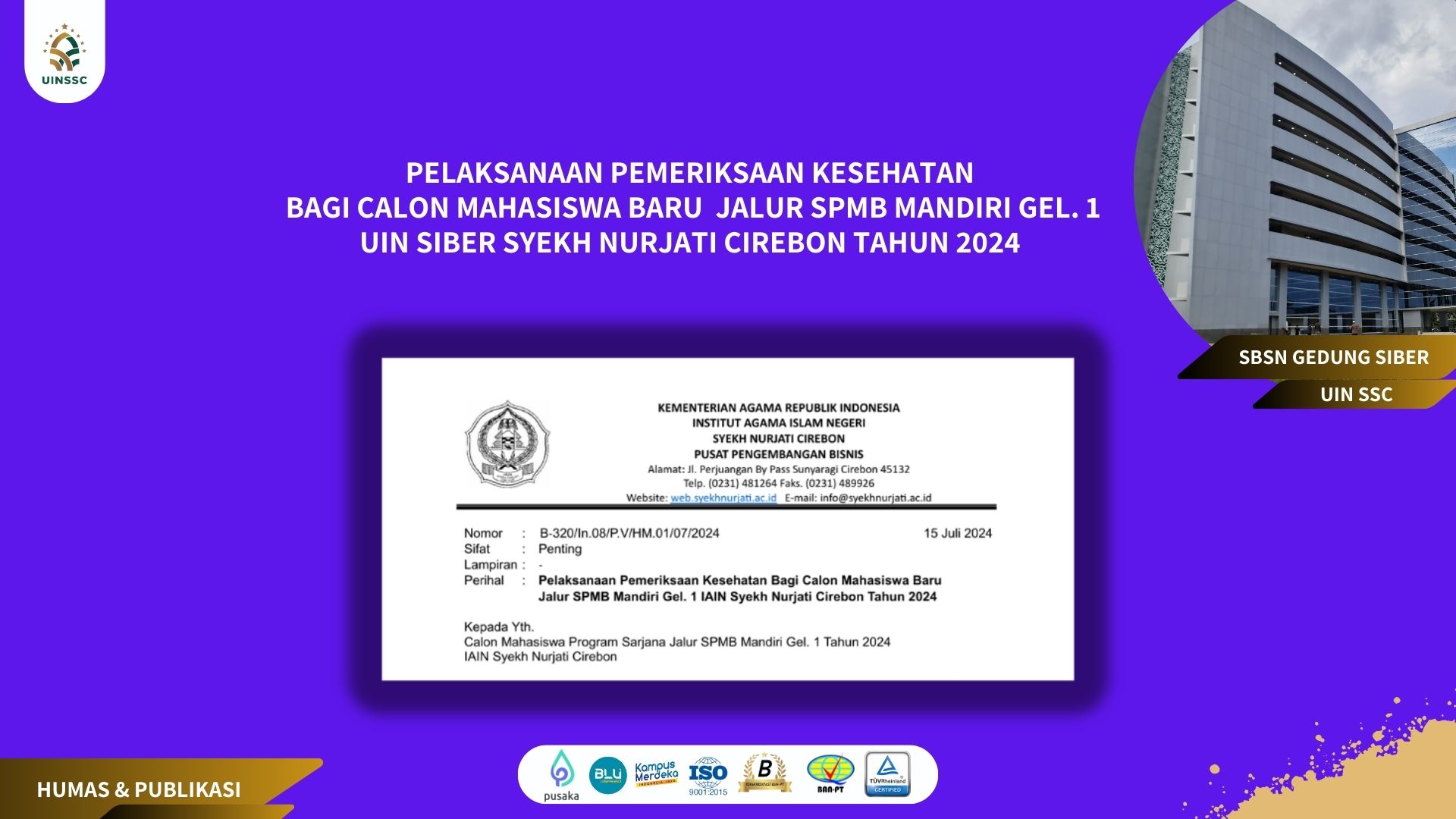 16 July 2024 • 1 Views • Pelaksanaan Pemeriksaan Kesehatan Bagi Calon Mahasiswa Baru Jalur SPMB Mandiri Gel. 1 UIN Siber Syekh Nurjati Cirebon Tahun 2024 Untuk Infomasi Selengkapnya Silahkan Unduh Link dibawah ini: SURAT EDARAN KESEHATAN JALUR MANDIRI GEL 1... Informasi Pengumuman