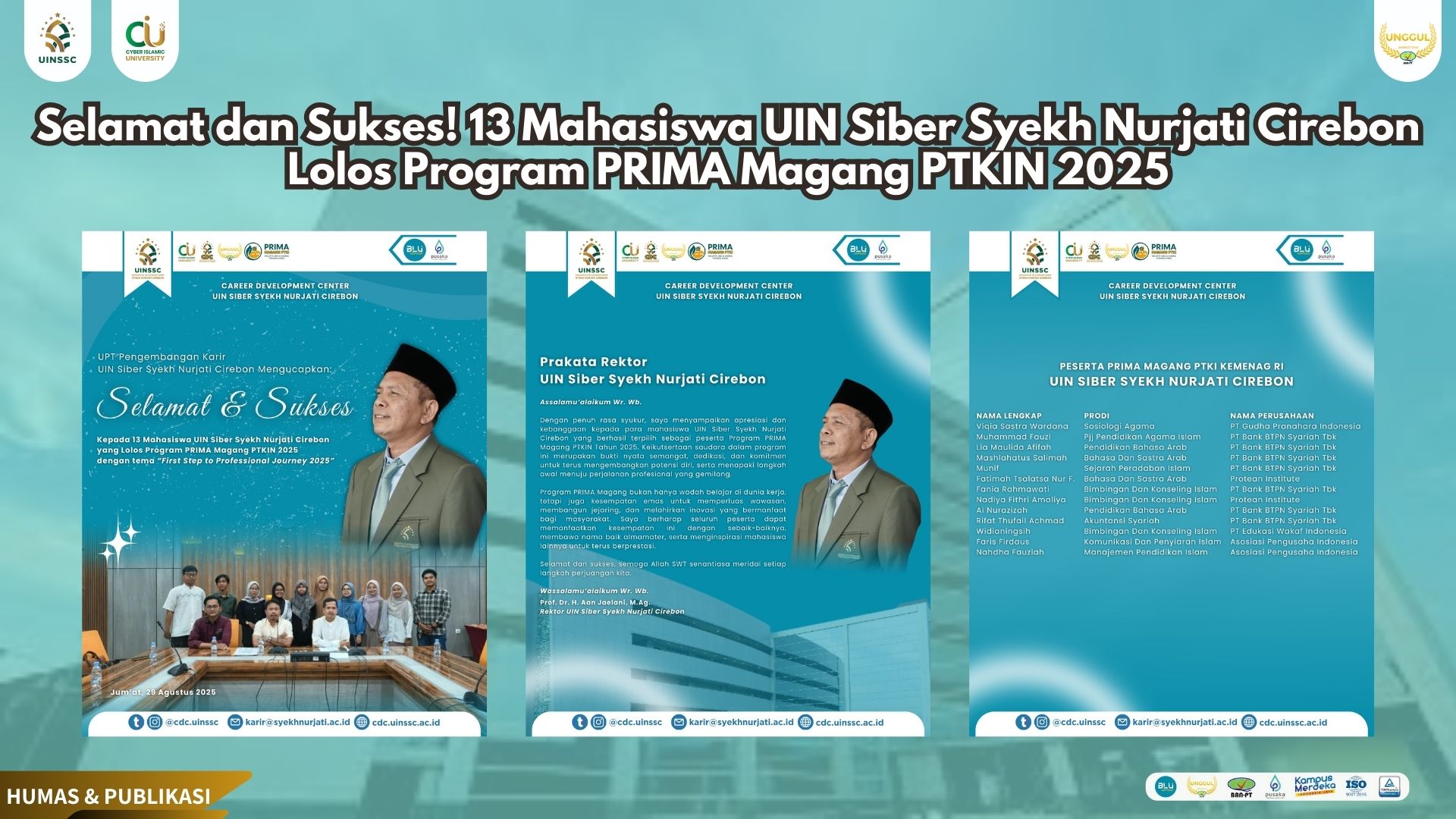 29 August 2025 • Selamat dan Sukses! 13 Mahasiswa UIN Siber Syekh Nurjati Cirebon Lolos Program PRIMA Magang PTKIN 2025 UIN Siber Cirebon — Universitas Islam Negeri (UIN) Siber Syekh Nurjati Cirebon, yang juga dikenal... Berita Kegiatan Pojok Rektor Prestasi