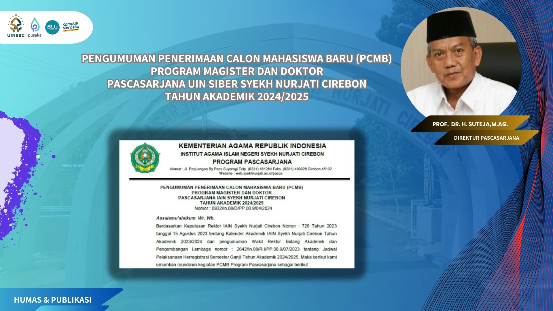 10 July 2024 • 4 Views • PENGUMUMAN PENERIMAAN CALON MAHASISWA BARU (PCMB) PROGRAM MAGISTER DAN DOKTOR PASCASARJANA UIN SIBER SYEKH NURJATI CIREBON TAHUN AKADEMIK 2024/2025 Untuk Informasi Selengkapnya Silahkan Unduh Link dibawah ini: PENGUMUMAN Rundown PCMB Program Pascasarjana 2024 Informasi Pengumuman