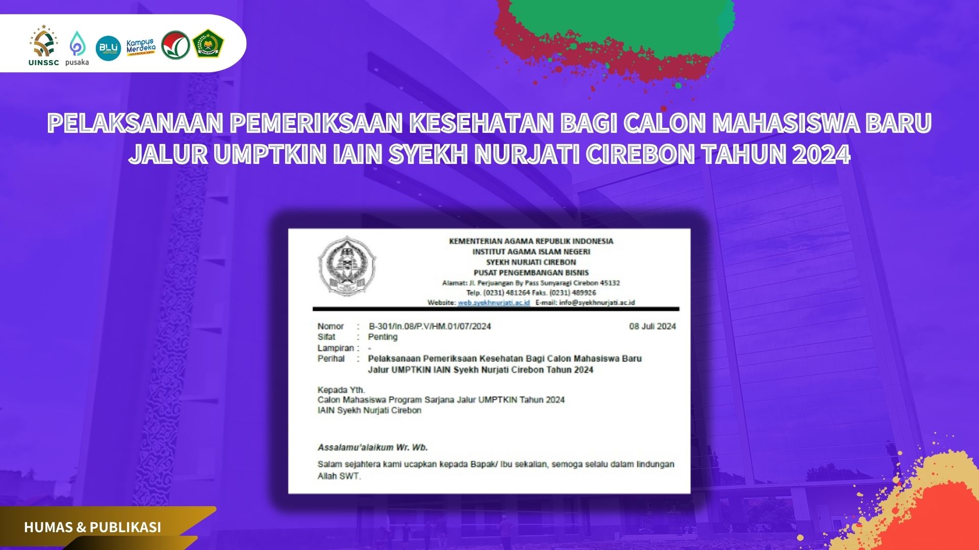 9 July 2024 • Pelaksanaan Pemeriksaan Kesehatan Bagi Calon Mahasiswa Baru Jalur UMPTKIN IAIN Syekh Nurjati Cirebon Tahun 2024 Untuk Informasi Selengkapnya Silahkan Unduh Link dibawah ini: SURAT EDARAN KESEHATAN UMPTKIN 2024 Informasi Pengumuman