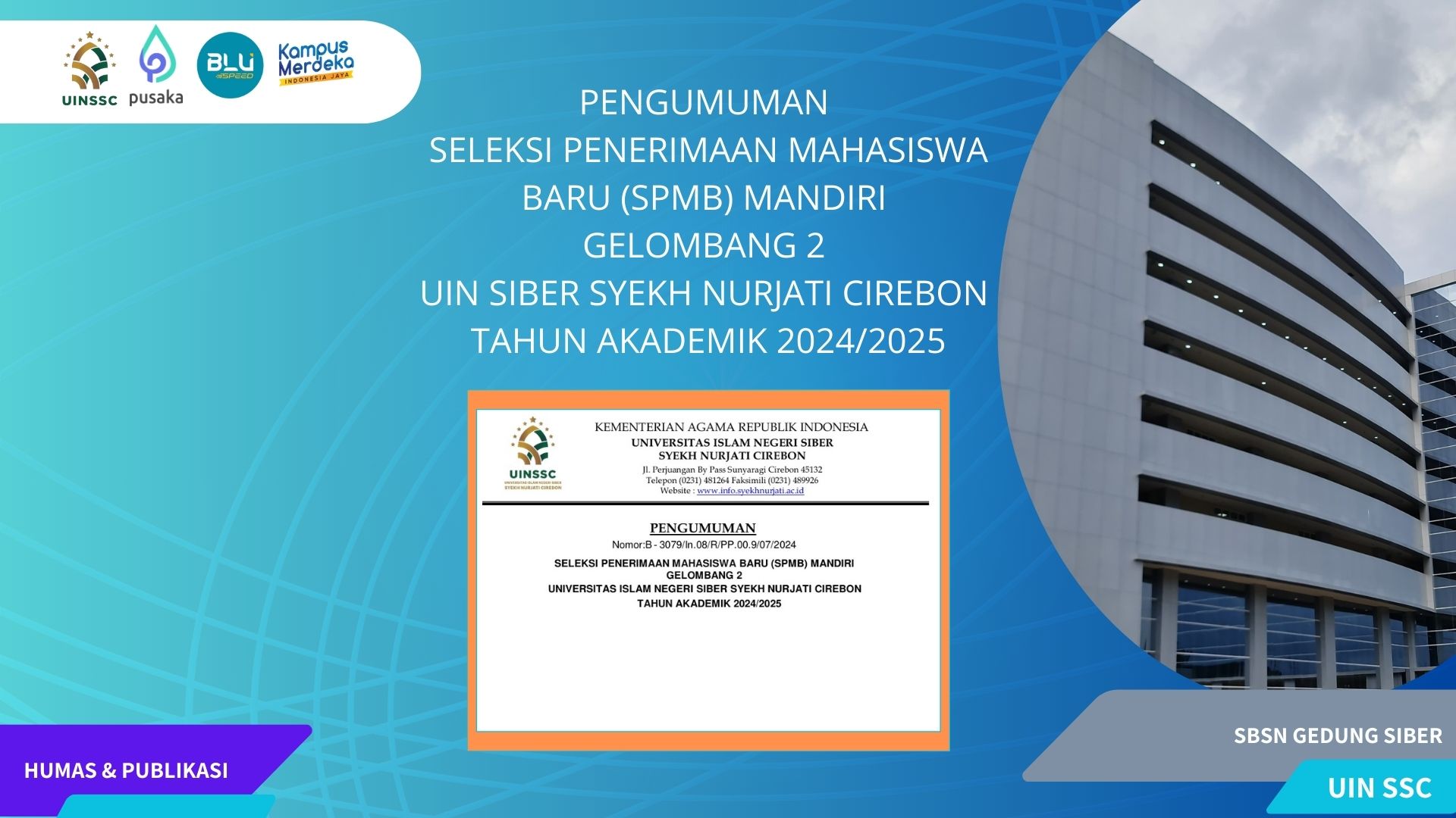3 July 2024 • 1 Views • PENGUMUMAN SELEKSI PENERIMAAN MAHASISWA BARU (SPMB) MANDIRI GELOMBANG 2 UIN SIBER SYEKH NURJATI CIREBON TAHUN AKADEMIK 2024/2025 Untuk Informasi Selengkapnya Silahkan Unduh Link dibawah ini: Pengumuman Mandiri II Informasi Pengumuman