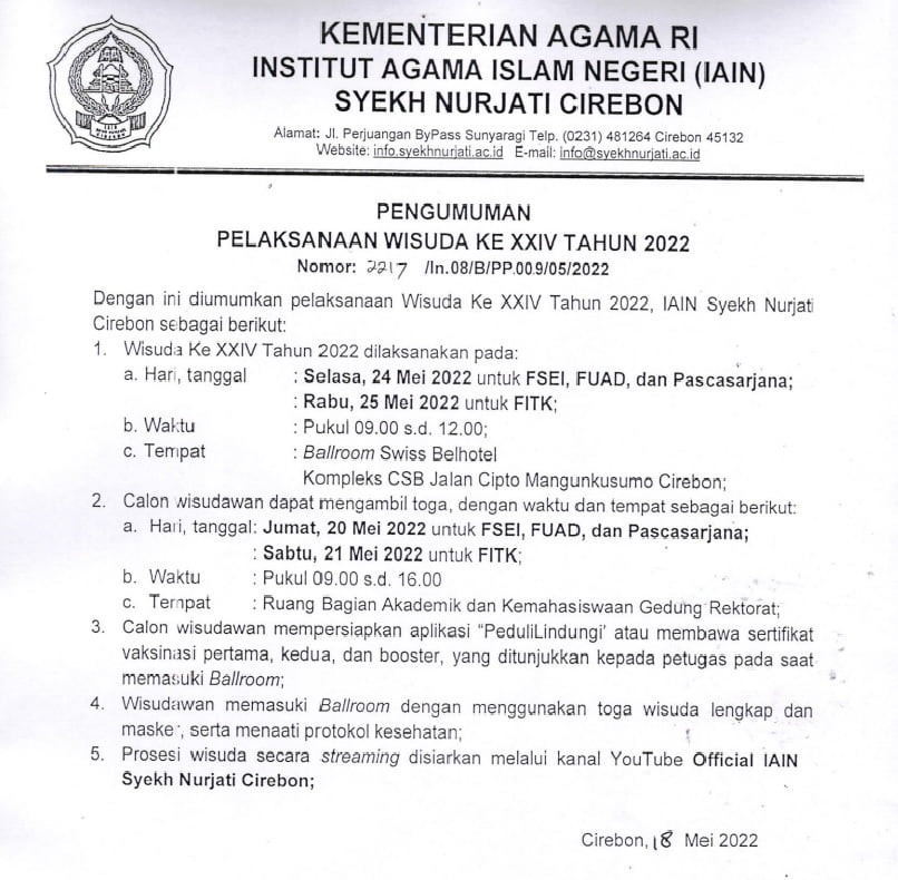 18 May 2022 • PENGUMUMAN PELAKSANAAN WISUDA KE XXIV IAIN SYEKH NURJATI CIREBON TAHUN 2022 PENGUMUMAN PELAKSANAAN WISUDA KE 24 TAHUN 2022 Pengumuman