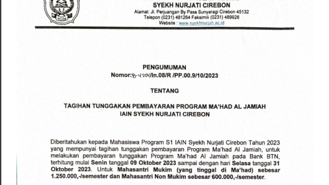 TAGIHAN TUNGGAKAN BIAYA PROGRAM MA’HAD AL JAMI’AH IAIN SYEKH NURJATI CIREBON 10 Oktober 2023 arifin Pengumuman 0 UNDUH PENGUMUMAN TAGIHAN TUNGGAKAN BIAYA PROGRAM MA’HAD AL JAMI’AH (OBSD)Tata Cara Pembayaran VA BTN IAIN NOMOR REKENING PEMBAYARAN PROGRAM MAHAD MAHASANTRI TA 2023-2024