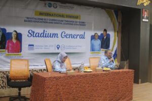 Narasumber internasional, Ana Mae M. Monteza, Ph.D., memaparkan pengalaman penerapan Outcome-Based Education (OBE) di Filipina yang terbukti efektif dalam mengembangkan kompetensi komunikatif siswa. Ia menekankan bahwa penggunaan teknologi digital harus diorientasikan pada pencapaian hasil belajar yang bermakna.