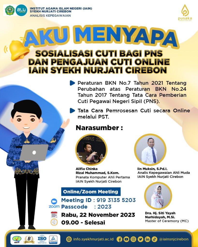 IAIN Cirebon – Ir. Sunarini, M.Kom. Kepala Biro AUAK IAIN Syekh Nurjati Cirebon, meluncurkan program inovatif bernama “AKU Menyapa.” Program ini bertujuan membuka ruang diskusi internal bagi tenaga pendidik dan kependidikan di IAIN Syekh Nurjati Cirebon. Program AKU Menyapa, dilaksanakan secara daring memalui zoom metting dan digawangi oleh unit kepegawaian. Rabu, (22/11/2023).