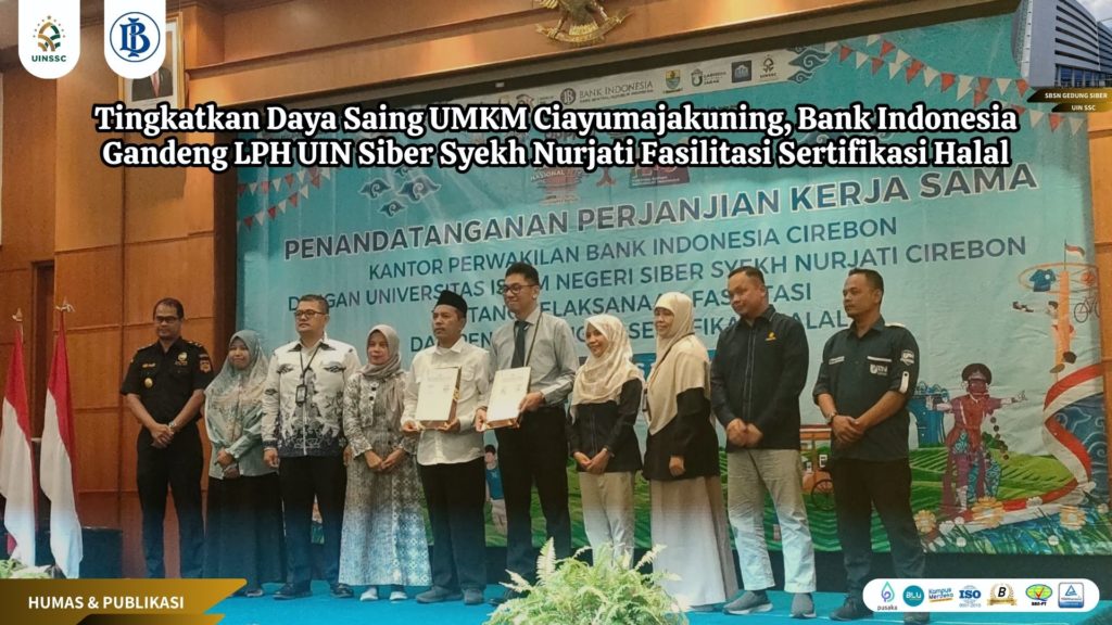 UIN Siber Cirebon – Dalam upaya meningkatkan daya saing Usaha Mikro, Kecil, dan Menengah (UMKM) di wilayah Ciayumajakuning, Bank Indonesia menggandeng Lembaga Penjamin Halal (LPH) UIN Siber Syekh Nurjati Cirebon untuk memfasilitasi sertifikasi halal bagi 100 pelaku UMKM. Kerjasama strategis ini ditandai dengan penandatanganan Perjanjian Kerjasama antara Rektor UIN Siber Syekh Nurjati Cirebon, Prof. Dr. H. Aan Jaelani, M.Ag., dan Kepala Kantor Perwakilan Bank Indonesia Cirebon, Anton Pitono, di Kantor Bank Indonesia Cirebon.