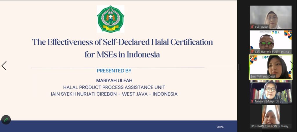 Ketua Pusat LPH Mariyah Ulfah, M.Esy menyampaikan Efektivitas Halal secara Self Declare untuk Program Sertifikasi halal untuk UMK di Indonesia. Sejauh ini Puast LPH IAIN Syekh Nurjati Cirebon telah membantu sekitar 8000an Sertifikat halal bagi UMK secara gratis dan berbayar.