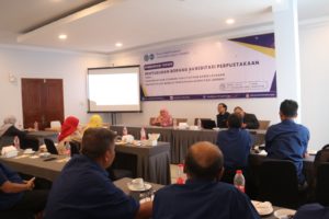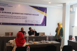 Heru Murdiyanto, M.Pd, sebagai salah satu tim penyusun borang akreditasi, bertindak sebagai moderator kegiatan BIMTEK Penyusunan Borang Akreditasi Perpustakaan. Dengan kecekatan, detail, dan sikap yang sedikit humoris, ia mempresentasikan draft dokumen borang akreditasi. Sementara itu, tim lainnya juga tidak kalah gesit dalam mencatat dan melengkapi informasi yang disampaikan oleh narasumber.
