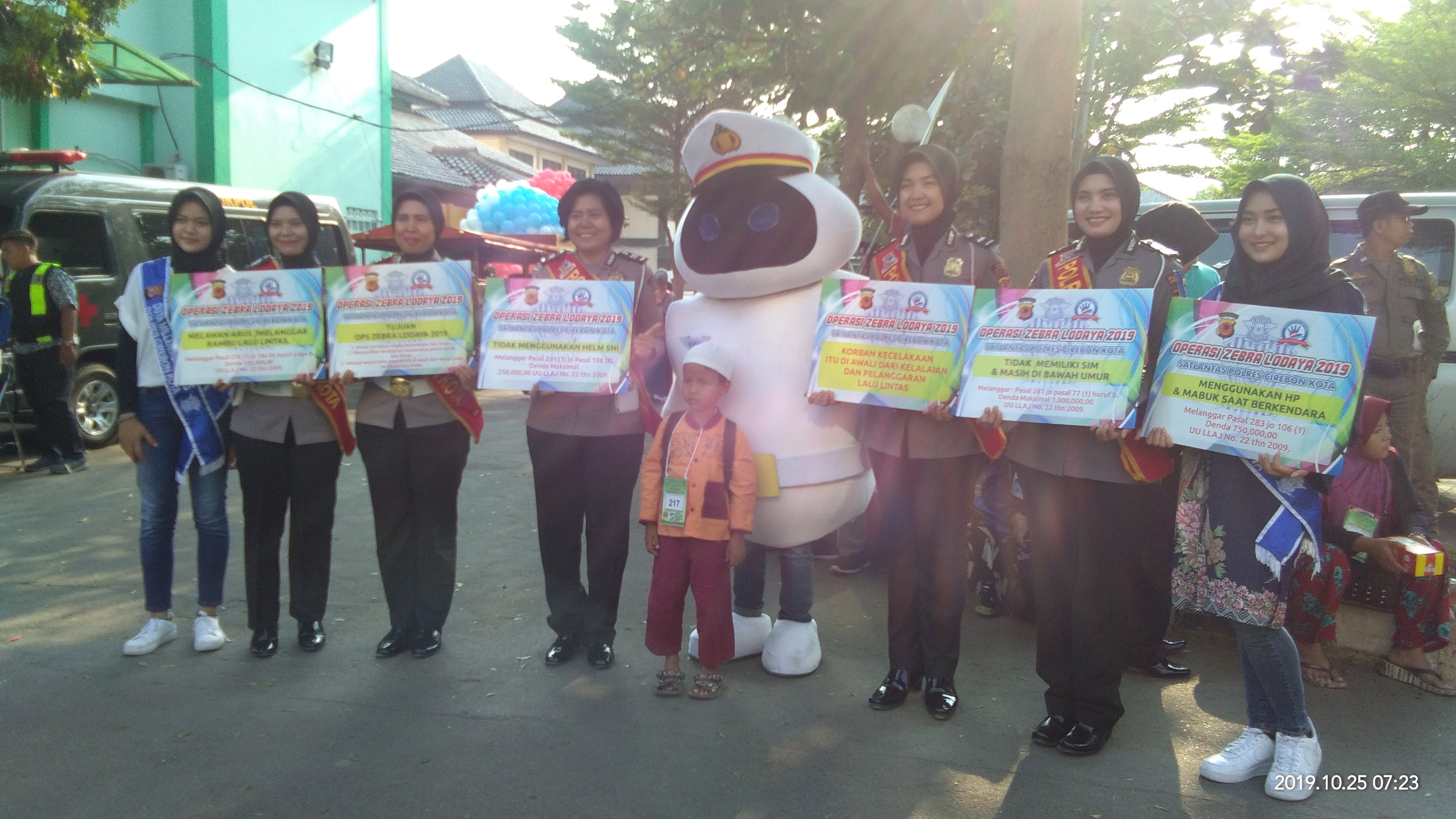 Jajaran Satlantas Polres Cirebon Kota sejak pagi sudah menyambut para peserta sunatan massal di halaman kampus IAIN Syekh Nurjati Cirebon. Polwan cantik ini berpakaian lengkap dengan ditemani sebuah boneka berpakain polisi sambil mensosialisasikan Operasi Zebra Lodaya 2019. Penampilan yang nyentrik dan menarik dari para Polwan ini, membuat banyak peserta sunatan massal dan orang tua mengabadikan moment menarik tersebut melalui telepon selulernya masing-masing. Sebelum itu, para Polantas Polwan ini juga melakukan sosialisasi kepada seluruh orang tua peserta sunatan massal dan tamu undungan, terkait Operasi Zebra Lodaya 2019. Mereka di atas panggung dengan membawa pamplet bertulisan himbauan berlalu lintas benar dan baik, juga mendapat sambutan hangat dari seluruh peserta dan orang tua.