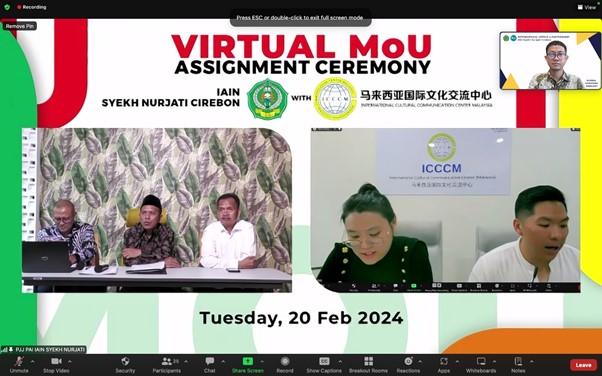 IAIN CIREBON – Hari ini, IAIN Syekh Nurjati Cirebon menandai babak baru dalam perjalanan pendidikannya dengan penandatanganan Memorandum of Understanding (MoU) secara virtual dengan the International Cultural and Communication Centre Malaysia (ICCCM), sebuah konsorsium kebudayaan dan riset yang berbasis di Malaysia dan didukung oleh ITEA (International Transnational Education Association) di Cina.Selasa, (20/02/2024).