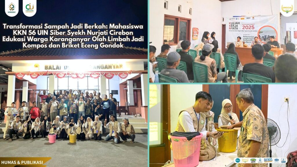 UIN Siber Cirebon (Karanganyar) – Mahasiswa Kuliah Kerja Nyata (KKN) Kelompok 56 Universitas Islam Negeri Siber Syekh Nurjati Cirebon (UIN SSC) melaksanakan program inovatif bertajuk “Pengelolaan Limbah Ramah Lingkungan” di Balai Desa Karanganyar, Kecamatan Panguragan, Kabupaten Cirebon. Kegiatan ini berfokus pada pemanfaatan sampah organik menjadi kompos dan pengolahan eceng gondok menjadi briket ramah lingkungan.(13/08).