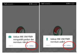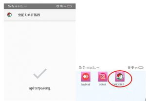 - Lakukan instalasi dengan mengklik aplikasi yang telah didownload, tunggu sampai proses selesai kemudian klik tombol “Selesai”. Pastikan aplikasi terinstal dengan memastikan munculnya icon aplikasi SSE UM PTKIN pada halaman Smartphone. Kemudian jalankan aplikasinya. Jika saat dijalankan membtuhkan perizinan untuk mengambil foto, video dan audio maka pilih izinkan.