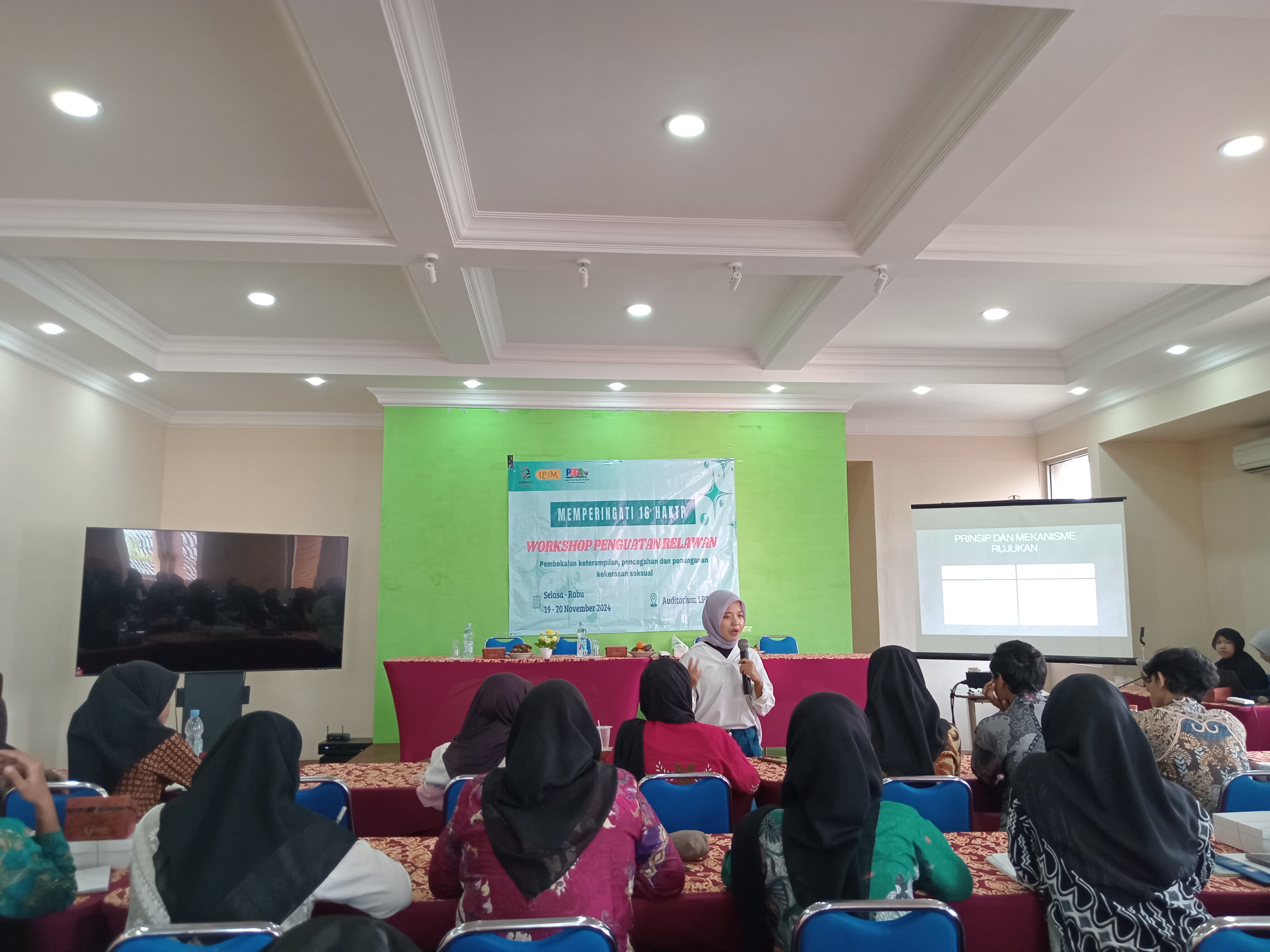 Hari kedua workshop diisi dengan diskusi dan pelatihan yang menghadirkan dua narasumber kompeten di bidangnya. Dewi Safitri, SH, alumni Prodi Hukum Keluarga Islam (HKI), membahas payung hukum dalam pencegahan dan penanganan kekerasan seksual. Ia menyoroti pentingnya memahami peraturan perundang-undangan sebagai dasar tindakan preventif dan responsif dalam kasus kekerasan seksual.