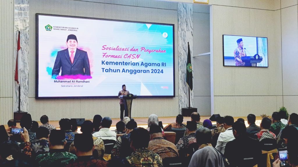 Prof. Dr. Ali Ramdhani, sekaligus secara simbolis menyerahkan formasi CASN Kementerian Agama Tahun 2024, dengan didampingi Plt Kepala BKN Drs. Haryono Dwi Putranto,M.Hum.,serta yang mewakili dari MenPANRB. Beliau menekankan pentingnya profesionalisme dan integritas dalam pengisian formasi CASN, agar dapat mendukung visi dan misi Kementerian Agama dalam memberikan pelayanan yang terbaik kepada masyarakat. tegas Prof. Dr. Ali Ramdhani.