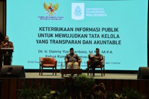 FGD ini juga menghadirkan narasumber nasional, Dr. Ir. Denny Yoesgiantoro, MM., MPA, Ketua Komisi Informasi Pusat Republik Indonesia, yang memaparkan materi bertajuk “Keterbukaan Informasi Publik untuk Mewujudkan Tata Kelola yang Transparan dan Akuntabel”. Ia menegaskan bahwa keterbukaan informasi publik merupakan fondasi utama dalam membangun kepercayaan masyarakat terhadap perguruan tinggi.