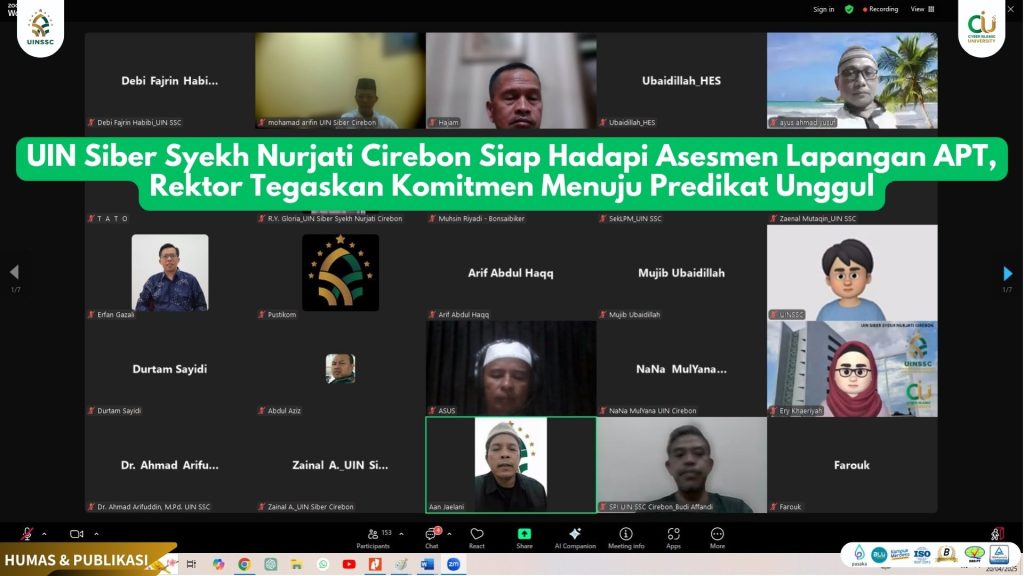 UIN Siber Cirebon — Dalam rangka menyambut pelaksanaan Asesmen Lapangan Akreditasi Perguruan Tinggi (APT), Universitas Islam Negeri (UIN) Siber Syekh Nurjati Cirebon menggelar Rapat Koordinasi Persiapan secara daring melalui Zoom Meeting pada Minggu (20/4). Rapat dipimpin langsung oleh Rektor UIN Siber Syekh Nurjati Cirebon, Prof. Dr. H. Aan Jaelani, M.Ag., dan dihadiri oleh jajaran pimpinan universitas, tim task force serta tim terkait lainnya.