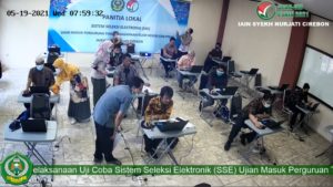 Panitia Lokal (PANLOK) Ujian Masuk Perguruan Tinggi Keagaam Negeri (UM-PTKIN) IAIN Syekh Nurjati Cirebon menggelar kegiatan uji coba ujian masuk dengan Sistem Seleksi Elektronik (SSE), kegiatan tersebut dilaksanakan di gedung M IAIN Syekh Nurjati Cirebon dengan menerapkan Protokol Kesehatan (PROKES). Rabu (19/5/2021).