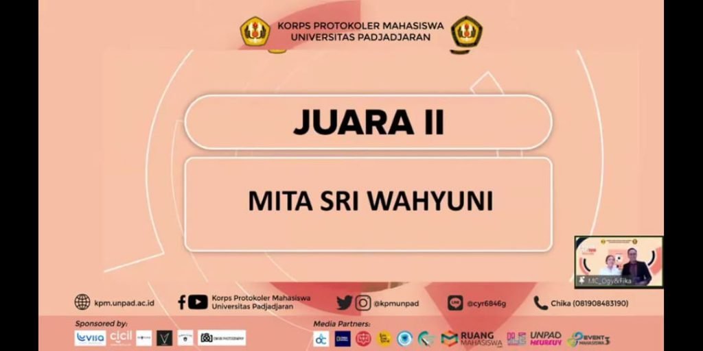 Prestasi membanggakan diraih Mita Sri Wahyuni. Mahasiswi Jurusan KPI Fakultas Ushuluddin Adab dan Dakwah IAIN Syekh Nurjati Cirebon berhasil mencatatkan namanya menjadi juara 2 Protocol Fair 2020 yang digelar Universitas Padjadjaran (UNPAD), Bandung, Minggu (15/11). Keberhasilan Mita membawa harum nama kampusnya di kancah Jawa Barat