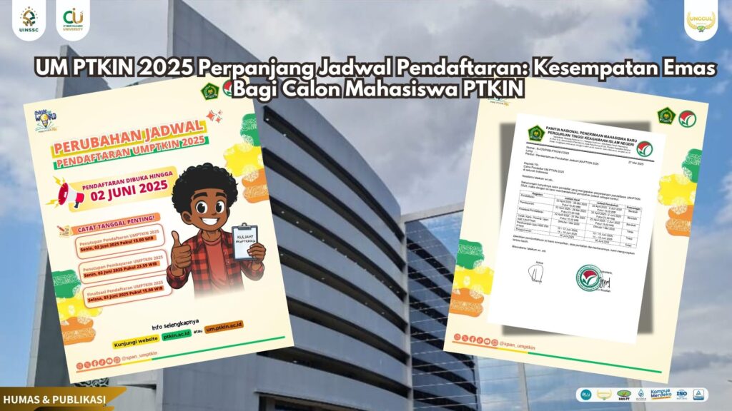 UIN Siber Cirebon (Jakarta)— Kabar gembira datang bagi para calon mahasiswa Perguruan Tinggi Keagamaan Islam Negeri (PTKIN) di seluruh Indonesia. Panitia Nasional Penerimaan Mahasiswa Baru (PMB) PTKIN 2025 secara resmi mengumumkan perubahan jadwal pendaftaran Ujian Masuk PTKIN (UM PTKIN) 2025. Kebijakan ini menjadi angin segar bagi peserta yang masih menghadapi kendala teknis maupun administratif. (28/05).