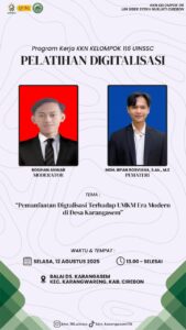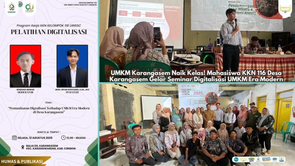 UIN Siber Cirebon (Karangasem) – Sebagai bagian dari program kerja nyata, mahasiswa KKN Kelompok 116 UIN Siber Syekh Nurjati Cirebon sukses menyelenggarakan seminar bertajuk “Pemanfaatan Digitalisasi Terhadap UMKM Era Modern di Desa Karangasem”. Kegiatan berlangsung di Balai Desa Karangasem pada Selasa (12/8) dengan melibatkan perangkat desa, lembaga masyarakat, dan para pelaku UMKM setempat.
